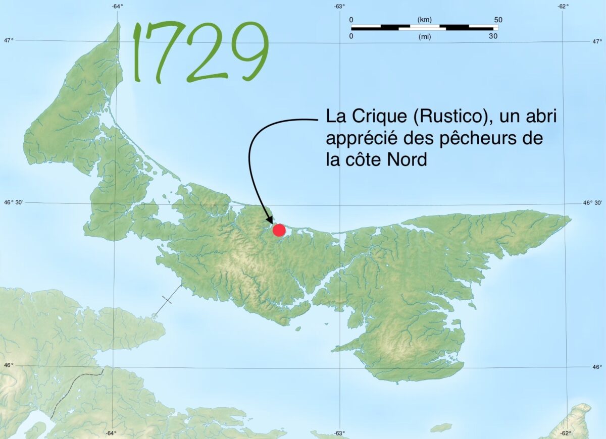 La baie de Rustico se situe à onze lieues de Havre Saint-Pierre (établie en 1719/1720) à l’est et à trois lieues de Malpèque (1728) à l’ouest. Les pêcheurs œuvrant entre les deux ports devaient naviguer près de 60 kilomètres (une lieue vaut 4 km) au gré des intempéries. À l’approche d’une tempête les bateaux prenaient refuge dans la rade de Rustico. Elle fut rapidement baptisée « La Crique » car sa géographie, y compris son chenal, offrait aux bateaux et à leur équipage une protection hautement appréciée. Les légendes racontent que La Crique a sauvé plusieurs marins d’une mort certaine.