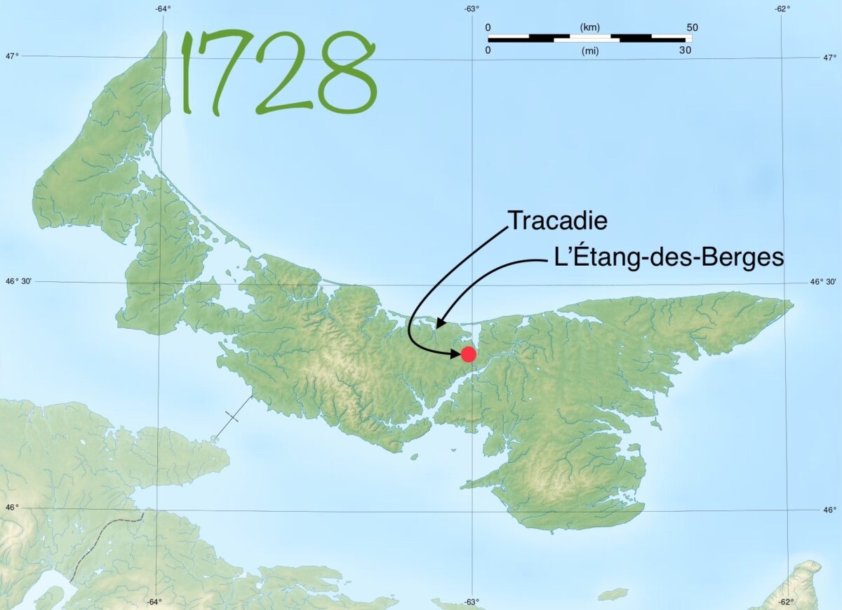 Les premiers colons de Tracadie, un nom Mi’kmaq signifiant « endroit idéal pour s’installer », arrivent sur les lieux en 1728. Avec entre-aide, ils érigent une cabane acadienne ayant la taille nécessaire pour héberger convenablement quatre familles distinctes, c’est-à-dire les Boudrot, les Bourg (Michel et Charles, deux familles) et les Belliveau. Ils s’installent sur le rivage occidental de la baie de Tracadie, un endroit paisible où l’eau potable est à portée main. Ensemble, ils sont vingt personnes, soit huit adultes et douze enfants. Étant tous paysans, Tracadie devient alors une petite communauté agraire où l’air est pur et où il fait bon vivre. Michel Bourg est le seul à posséder une goélette. Peut-être sont-ils tous arrivés en même temps par la mer. En 1728, Tracadie est la quatrième plus grande colonie de l’Isle Saint-Jean (297 habitants au total), après Havre Saint-Pierre (116), Port-LaJoye (105), et Havre aux Sauvages (27). Le site est idyllique. Les Mi’kmaqs n’auraient pu choisir un meilleur nom.